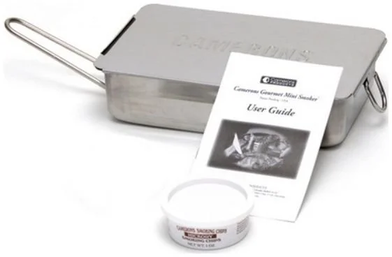 Hot smoke in minutes right on your own stove top. Prepare delicious moist smoke-flavored dishes quickly and without fuss with this indoor smoker! Smoke food without adding extra calories! Salmon, chicken, meats, and vegetables are all smoked right on your stovetop with your choice of included wood chips. Perfect for a small family or a special dinner for two. This Mini indoor Smoker works exactly like the Original larger one, but is half the size. At 7 x 11 inches it is great for cooking for two, or for the smaller things you want to infuse with the smoky flavor. It comes with Hickory and Cherry flavored wood chips, instructions and recipes.